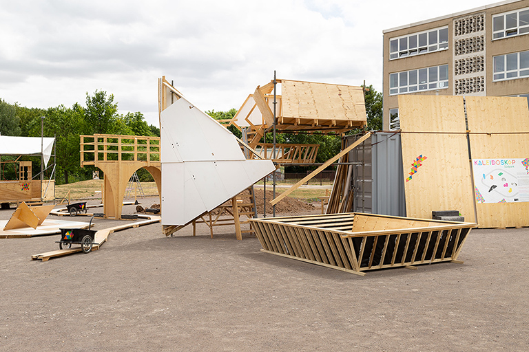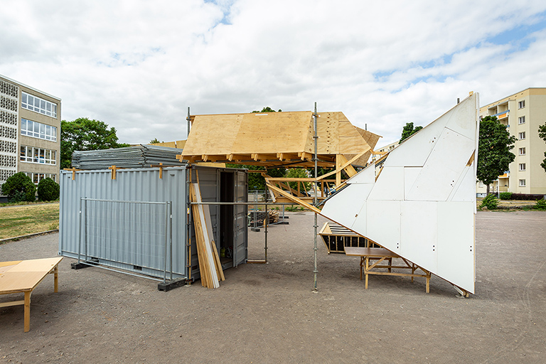 Hier ist eigentlich nur ein Parkplatz für Autos gewesen … und wir bauen jetzt erstmal eine Struktur hin. Wir sind vielleicht nicht die Einzigen, die, wenn sie diesen Platz am Südpark in Halle-Neustadt betreten, denken, hier müsste man mal was tun: Eine überdimensional große homogene Schotterfläche zwischen einem abgelegenen Parkeingang, Plattenwohnbauten und einer Grundschule, vorrangig vom Lehrerkollegium und einigen Anwohnern als Parkplatz genutzt, obwohl in dem Viertel ausreichend Parkplätze vorhanden sind. Das brachte die Initiator*innen des Kaleidoskop-Projekts Maik, Maike und Johanna auf die Idee: Kann dieser Ort nicht auch einmal testweise anders aussehen, anders genutzt werden, vor allem durch die Kinder, die hier wohnen?