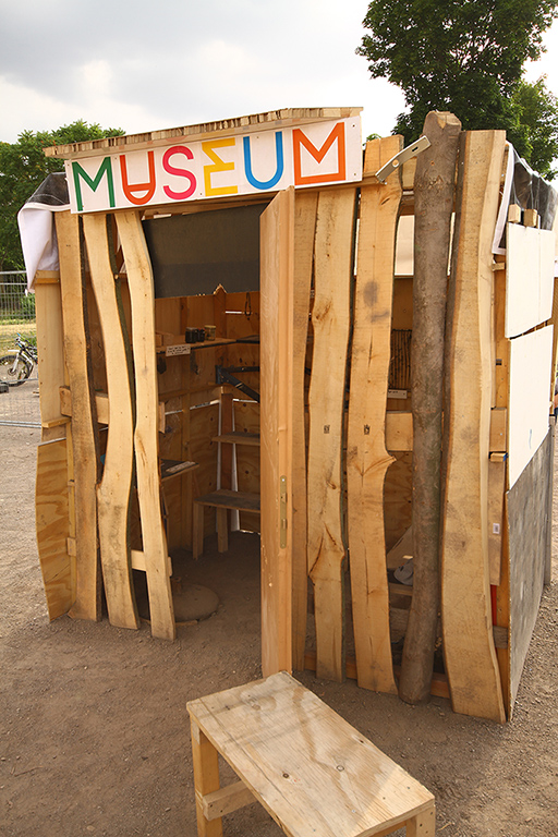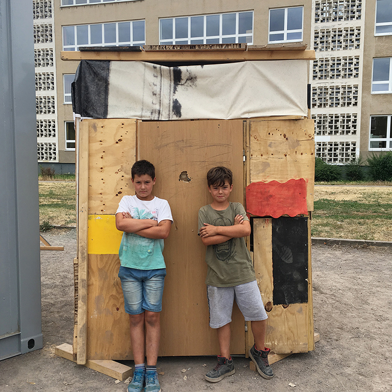 Sommerferien 2019: Zusammen mit Kindern des Viertels entsteht aus einer simplen von uns vorgegebenen baulichen Struktur ein Dorf, ein kleines Festivalgelände, ein Musikplatz, ein Radioplatz, ein Schlammplatz. Auf einmal produziert dieser Platz für viele Kinder völlig neue Erfahrungen, es entstehen Geschichten, Beziehungen, neue vertraute Orte. Die Kids bringen unterschiedlichste Hintergründe, Geschichten und Energie mit, sie sind neugierig und es ist zu merken, dass sie wirklich Lust haben auf neue Erfahrungen. Wir, die Erwachsenen, die die Kinder eingeladen haben und ihnen hier helfen, versuchen, dass dieses gemeinsame Bauen eine Art gemeinsame Sprache entstehen lässt, so dass sich alle intuitiv verstehen können. Bauen ist eine Form von Sprache, die alle einschließt. Man muss nur sehen, und das erfordert viel Aufmerksamkeit, dass alle ihren Platz finden, alle etwas zu tun bekommen und niemand frustriert ist. Aber das ist machbar und es macht letztlich großen Spaß, weil das wuselige, von außen chaotisch anmutende Baugeschehen, unendlich viele kleine Erfolgsgefühle und -momente bei den Kindern hervorzaubert. Viele erfahren zum ersten Mal, wie es ist eine Schraube geschraubt zu haben, sie merken, dass irgendwas klappt, dass sie selbstständig Gegenstände bauen können, sie erfahren ihre eigene Autonomie, ihr Können und ihre Grenzen. Und das ist unglaublich toll.