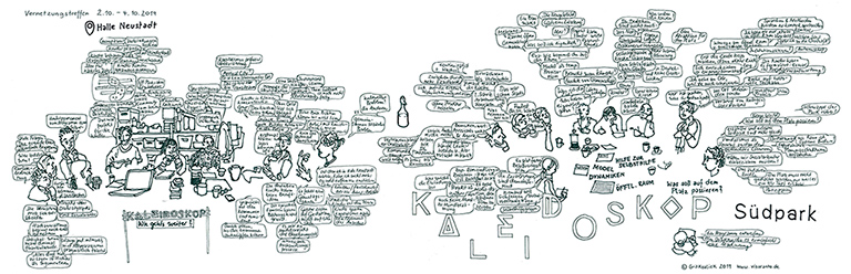 Mehrere Sessions diskutierten wir gemeinsam. Thema war die Sommerferienaktion von Kaleidoskop mit Schüler*innen auf dem Platz vor der Salzmannschule, den sie den Platz ohne Namen nennen. Denkwelten und ganz unterschiedliche Formen, sich an der Diskussion zu beteiligen, prallten aufeinander. Maike erzählte, fragte, suchte. Eva versetzte sich hinein, hinterfragte und positionierte sich. Grit zeichnete – uns, unsere Gedanken, ihre Sicht darauf. Juan zeichnete auch, aber Lösungen für die im Gespräch aufgeworfenen Fragen. Anna trug ihre Eindrücke bei und Lutz sprach über seine Gefühle. Ich versuchte im Kopf zu ordnen, was ich nicht verstand, was neu für mich war: Wer spricht worüber? Inwiefern sprechen sie über das gleiche? Wo treffen sich die Gedanken? Aber das war mein Problem, nicht ihres, denn sie sprachen, griffen auf, führten weiter, fragten.