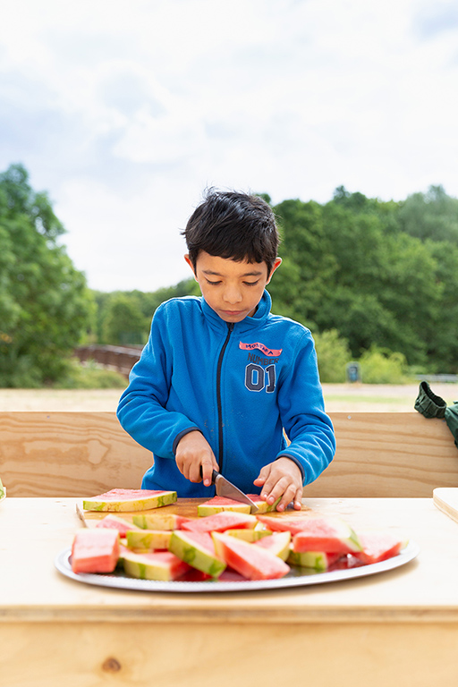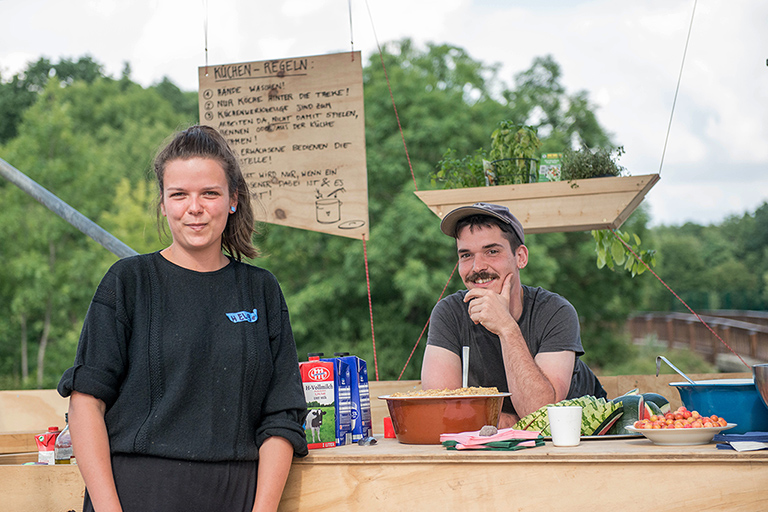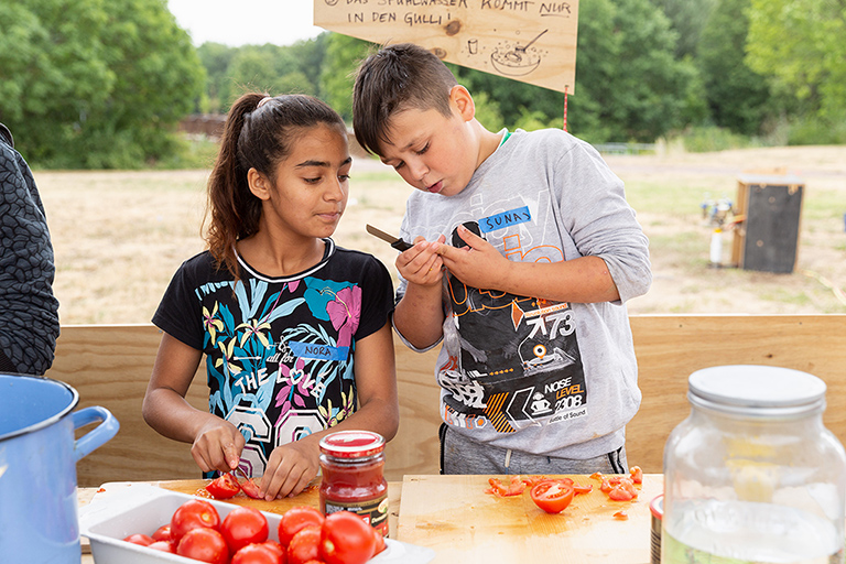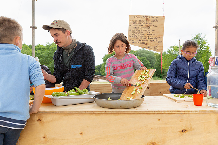 Es ist Mittwoch und ein paar Kinder haben am Vortag entschieden, dass es Käsespätzle geben wird. Wir laufen zu viert mit dem Fahrradanhänger zu Mehmet in den Multimarkt und kaufen große Mengen Eier, Weizenmehl, Zwiebeln und einen kräftigen Käse. „Das reicht nicht!“ – „Soooo viel?!“, „Ich will keine Spätzle, was soll das sein?“, „Ich will Pizza!“ Zurück an der Küche bricht ein erbitterter Kampf aus, wer die Eier in die drei überdimensionierten Schüsseln schlagen darf. Ich schäle und schneide Zwiebeln. Ein Kind versucht, auf den Tisch zu klettern und über die Arbeitsplatte zu laufen. „Das ist Männerarbeit“, „Das esse ich nicht, das ist eklig“, „Jeder nur fünf! Jetzt gib mir die Schachtel!“ Der Teig ist fast fertig, das Rühren war ganz schön anstrengend. Käse reiben ist angesagt, allerdings wird 25 Prozent des Reibguts direkt weggenascht. Während ich die Röstzwiebeln brate, versuche ich zu verhindern, dass Spuckehände im Käsehaufen landen. „Das sieht immer noch eklig aus.“ „Eklig, ess ich nicht, ich hol mir nachher Chips.“ „Was soll das sein, ich will lieber Pizza.“ Der Kochtopf ist groß und heiß, die Schüssel schwer und die Kinder stehen jetzt schon an. Stromausfall. Strom geht wieder. Die Auflaufformen werden langsam mit Käse und heißen Spätzle gefüllt. Die Essensausgabeschicht steht schon seit einer halben Stunde mit den Schöpflöffeln in der Küche, wartet und weist andere Kinder zurecht. „Ich will das nicht!“, „Mehr!“, „keine Zwiebeln! KEINE ZWIEBELN!“, „Ok, ich probier es, aber ich werde nichts essen.“ Ungefähr 60 Kinder essen, fast alles restlos, ein besonders ausgewählter Gaumen hält nach dem Tellerspülen beide Daumen nach oben. Ich stehe an der Spüle und halte alle an, die Teller nicht nur ins Wasser zu tauchen, sondern abzuwaschen. „Lecker, morgen will ich das nochmal“, „Das Beste, was ich jemals gegessen habe!“ „Das will ich jetzt jeden Tag.“ „Was soll es morgen geben?“ „PIZZA!“